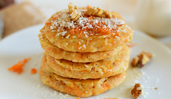 Bananu oljuštiti i iseći na kolutove. Šargarepu oljuštiti i izrendati na sitno rende. U blender staviti kolutove banane, izrendanu šargarepu i jogurt i dobro izmutiti u krem. Jaje sa malo soli penasto umutiti mikserom. U umućeno jaje dodati med, vanilin šećer – burbon, blenderom umućen krem i brašno. Najmanjom kutlačom vaditi umućenu masu za palačinke, izliti na sredinu tiganja i lagano razvući u krug. Peći na srednjoj temperaturi, okrenuti i peći sa druge strane. Palačinke složiti na tanjir za posluživanje. Svaku palačinku lagano preliti sa malo javorovog sirupa i rendanom šargarepom.
